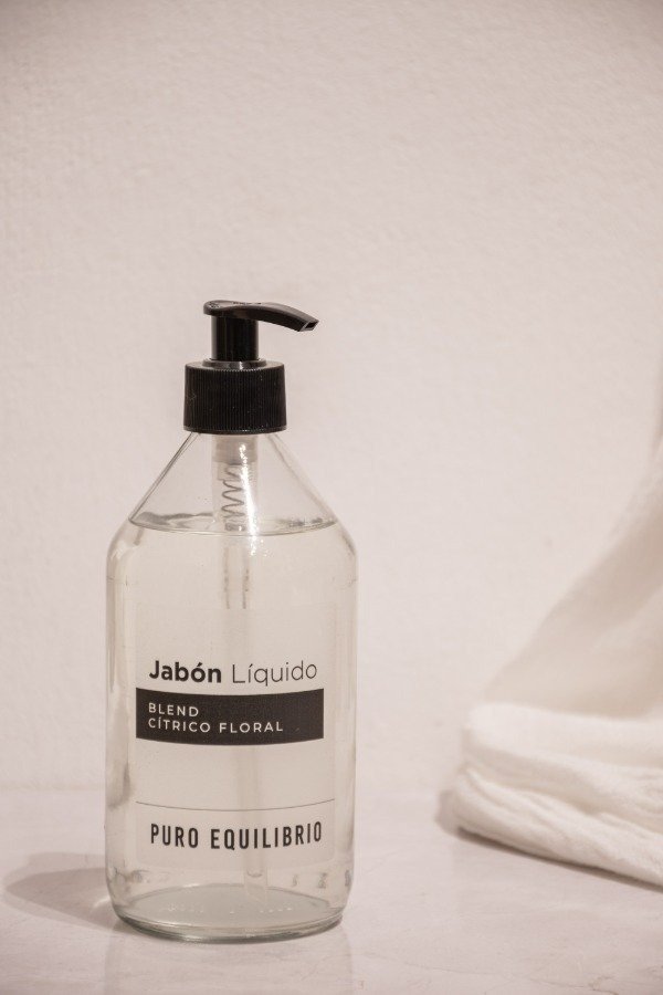 Dispenser en vidrio transparente con vávula plástica. Que por supuesto lo pensamos para reutilizar!
